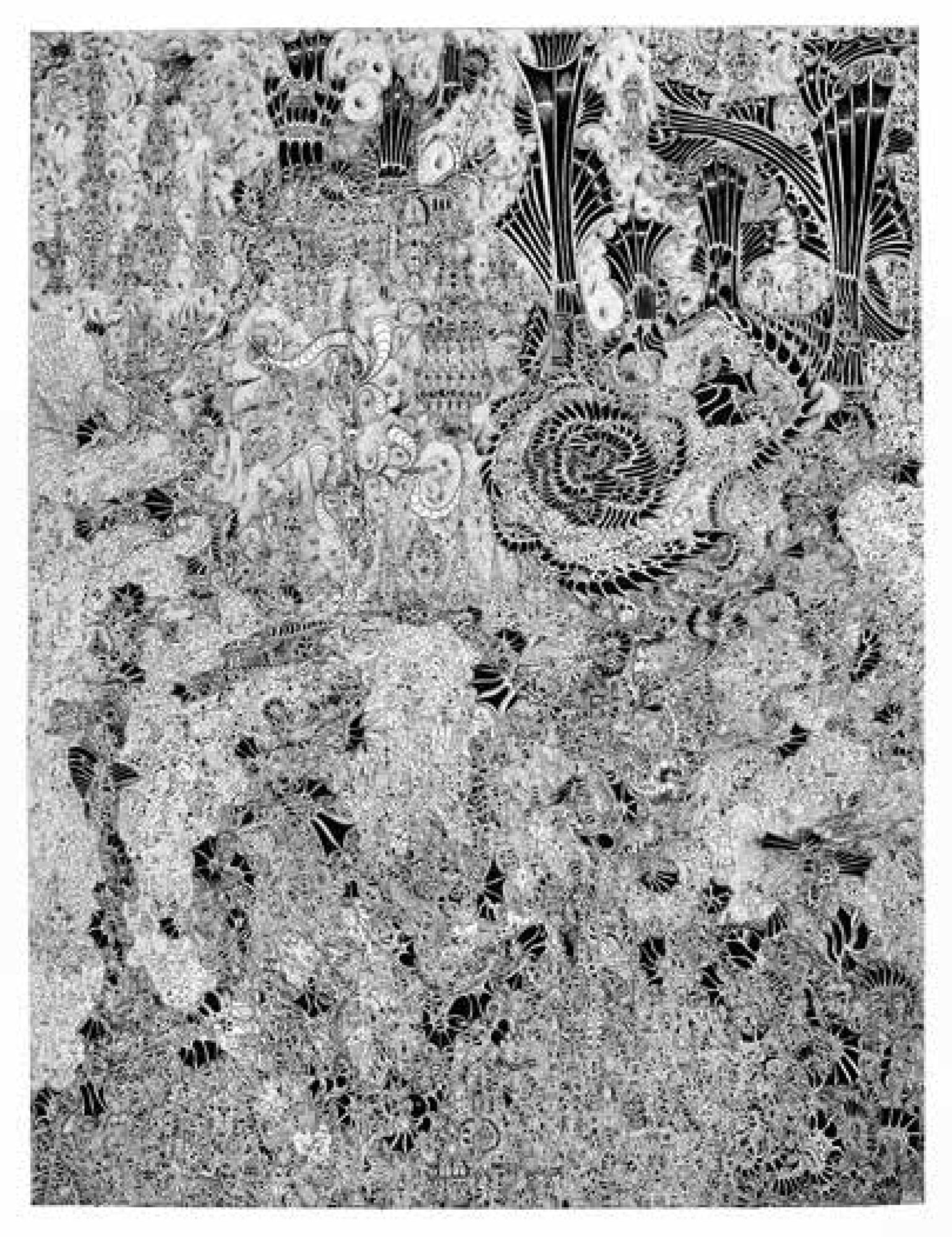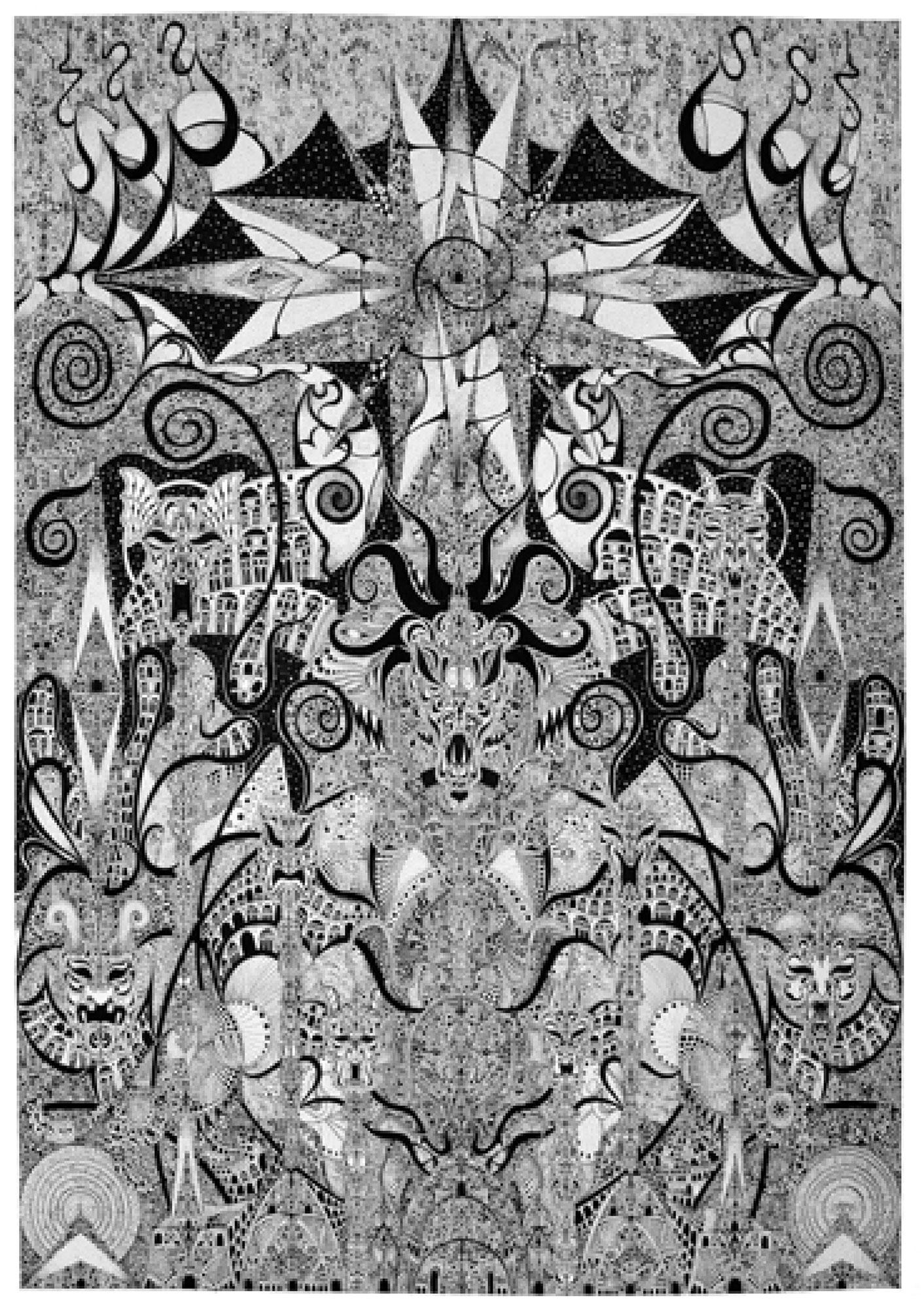 Jean-Pierre Nadau: is a french illustrator originally from Paris, now living in the Alps. In 1987, self-taught, he took up drawing . Expressing himself only in black and white, using Indian Ink or Pigma Micron pen, he covers sheets and canvases with complex graphics, some of very large dimensions (up to 12 meters wide). Recognized within the Outsider Art movement, he is represented in numerous public and private collections in Europe, Japan and the United States, particularly in New-York where he regularly exhibits.